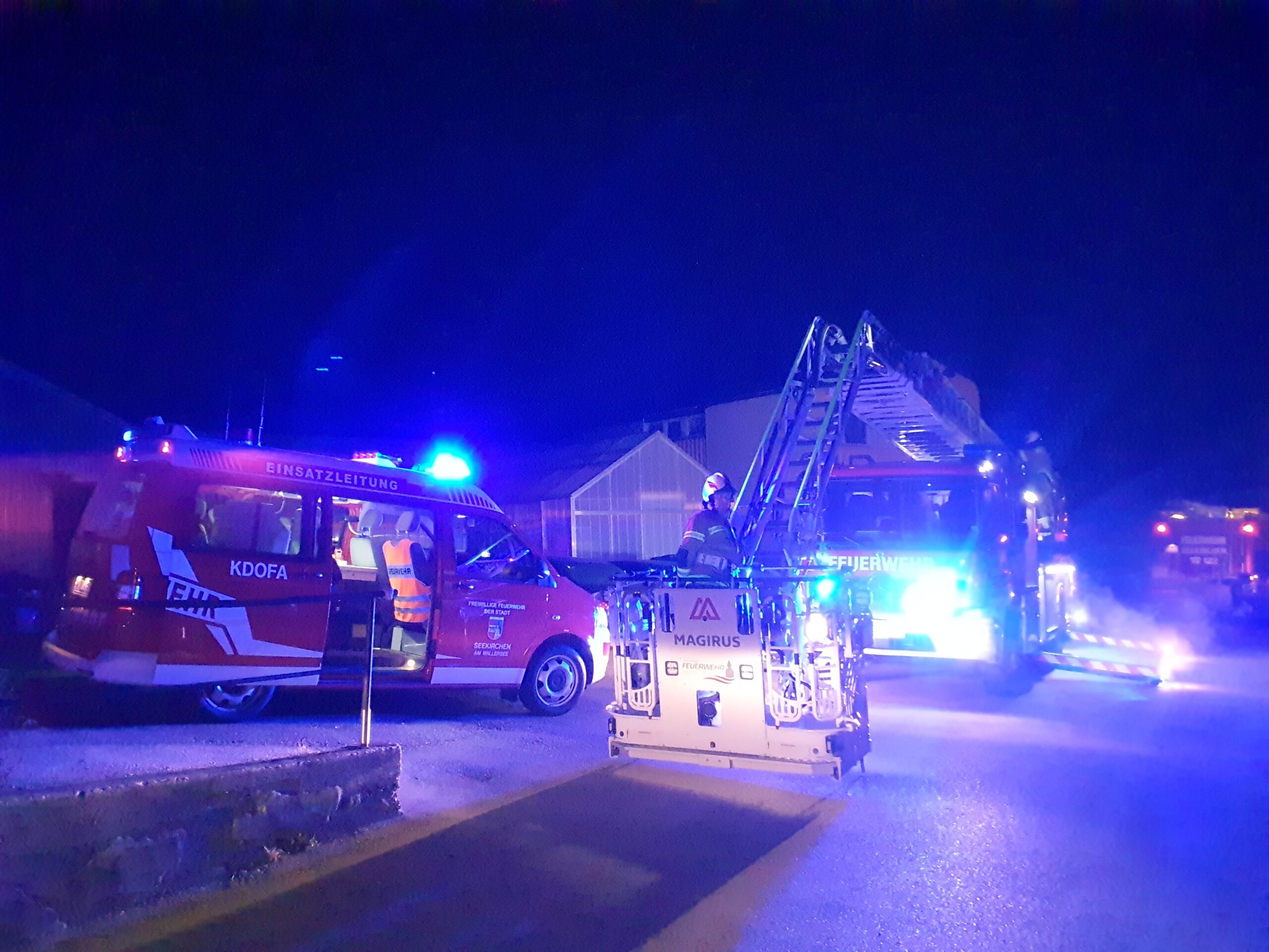 Während der Einsatznachbesprechung wurde die Drehleiter zu einem abgedeckten Wirtschaftsgebäude in Henndorf angefordert.
