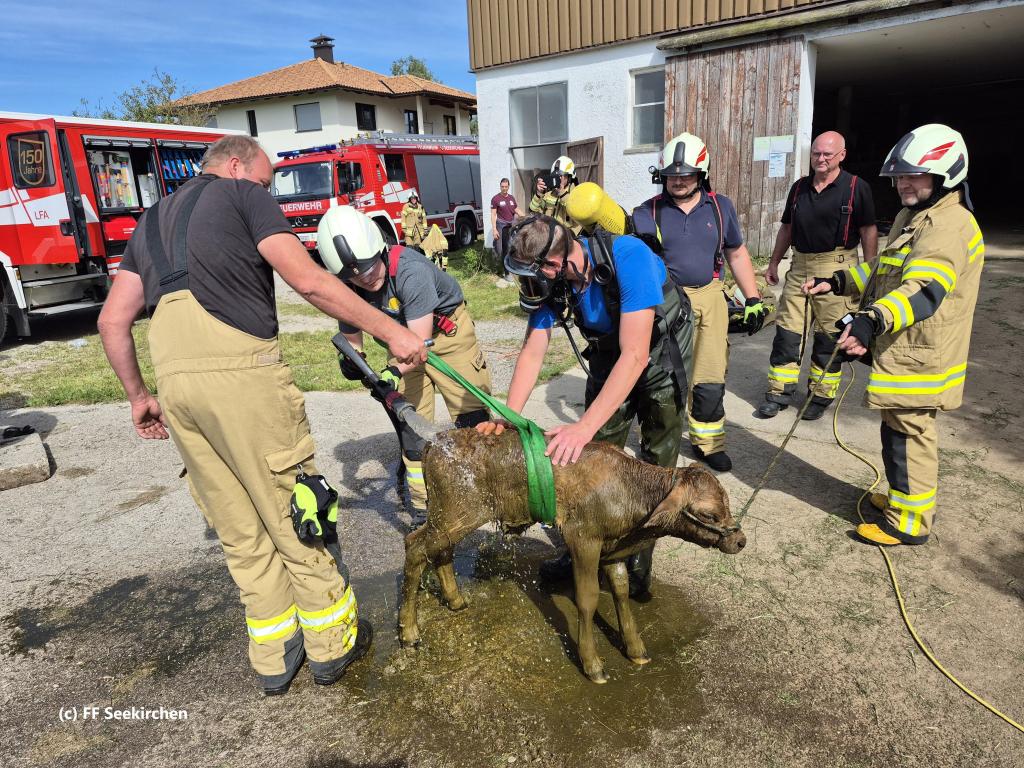 Der Löschzug Wirthenstätten und die Hauptwache Seekirchen wurden um 10.38 Uhr zu einer Tierrettung (Kalb in Güllegrube) allarmiert.