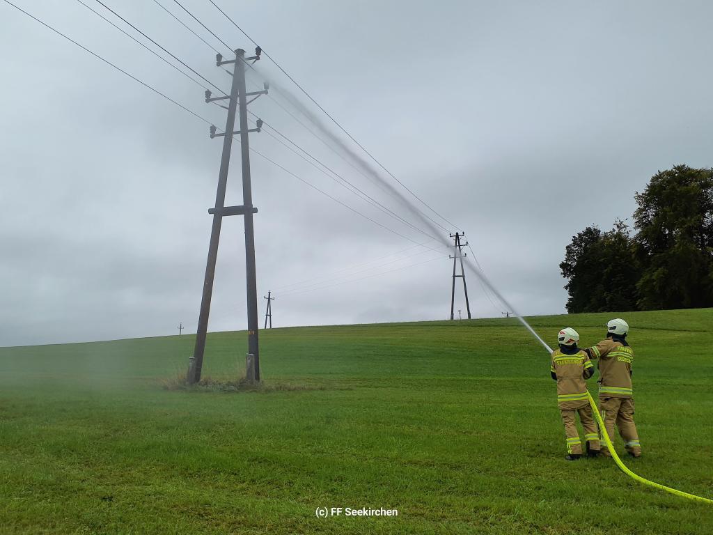 Beim Eintreffen der Feuerwehr stand ein Strommast in Brand.