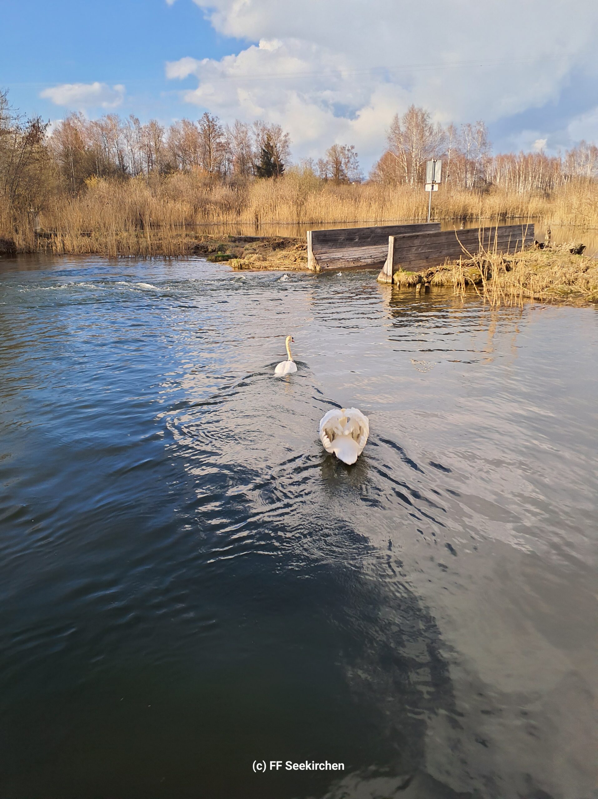 Am heutigen Nachmittag wurde die Feuerwehr Seekirchen zu einer Tierrettung an die Fischach alarmiert. Vor Ort wurde ein Schwan vorgefunden, der sich mit dem Kopf zwischen zwei Holzpfosten einer Uferverbauung eingeklemmt hatte.