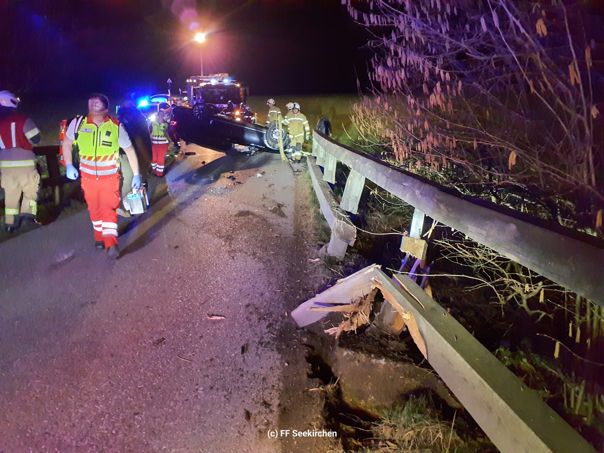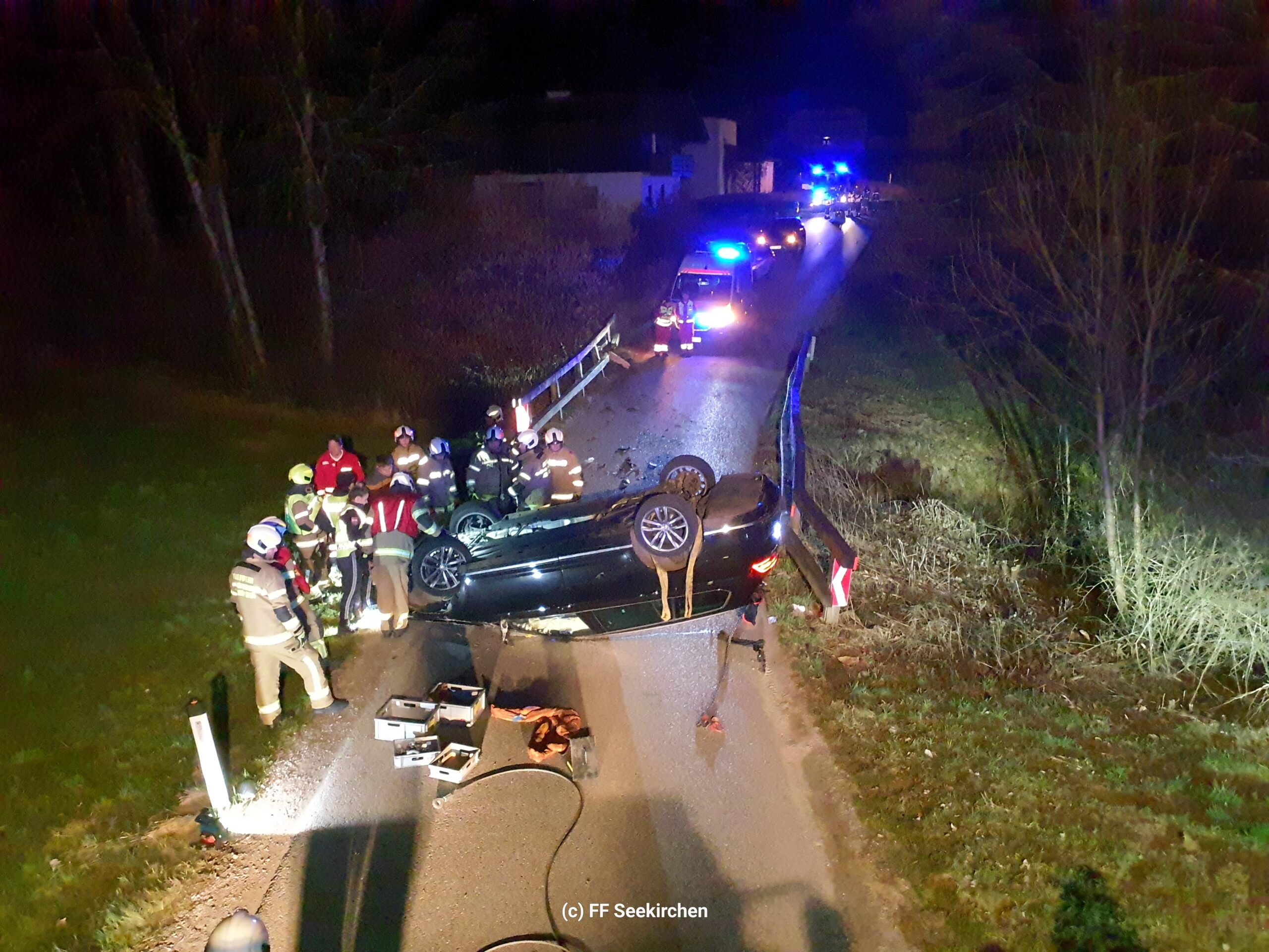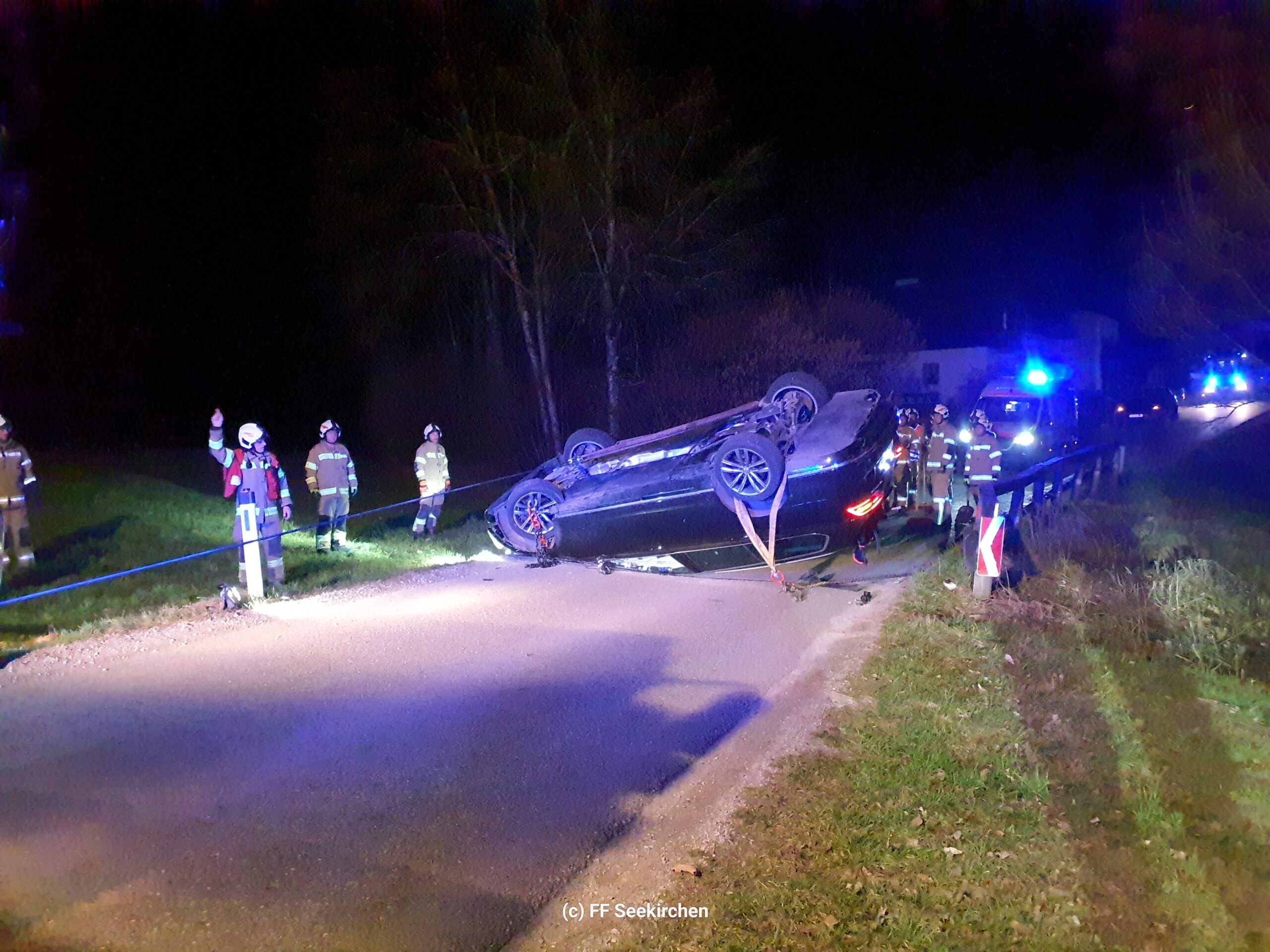 Am frühen Samstagabend wurden wir heute gemeinsam mit dem Löschzug Schöngumprechting zu einem Verkehrsunfall im Ortsteil Mayerlehen alarmiert. Beim Eintreffen stellte sich heraus, dass ein PKW das Brückengeländer touchierte und in weiterer Folge am Dach zu liegen kam. Für die Feuerwehr beschränkten sich die Arbeiten auf die Absicherung der Unfallstelle sowie die Unterstützung des Abschleppunternehmens.