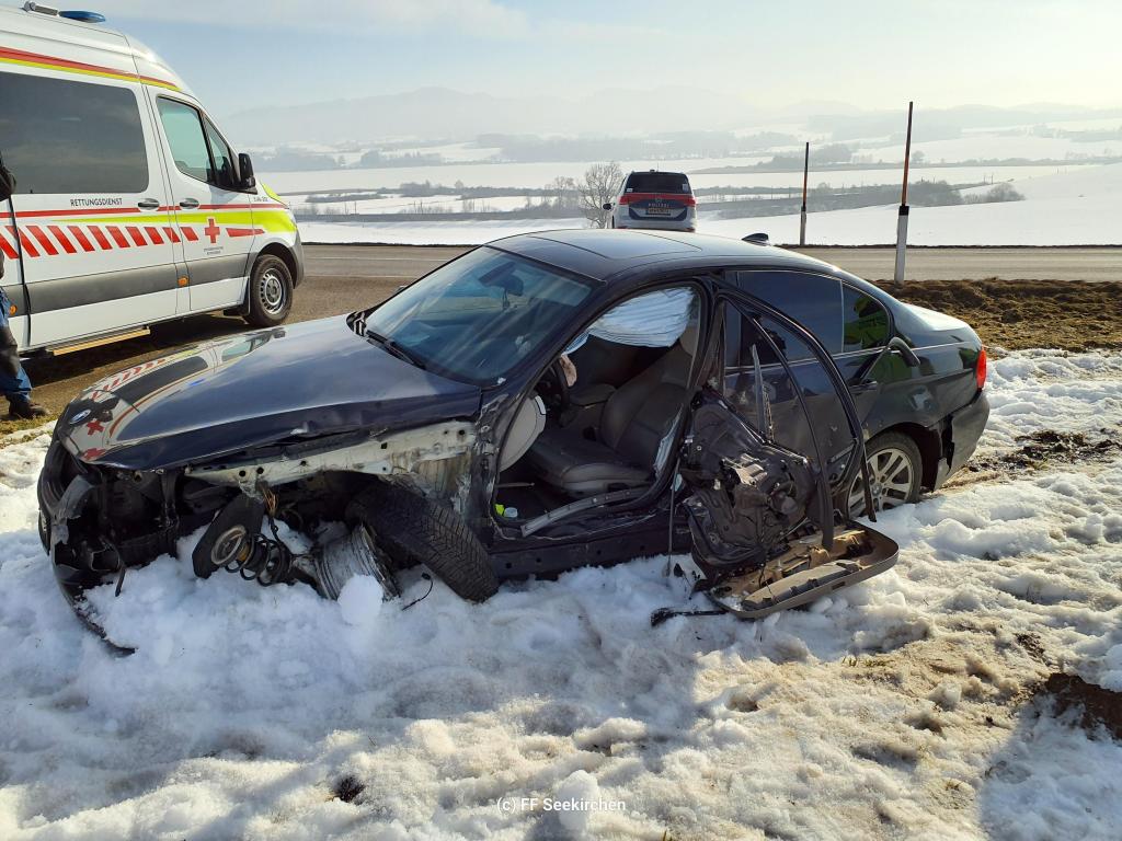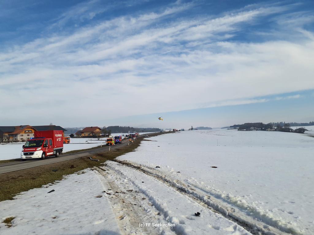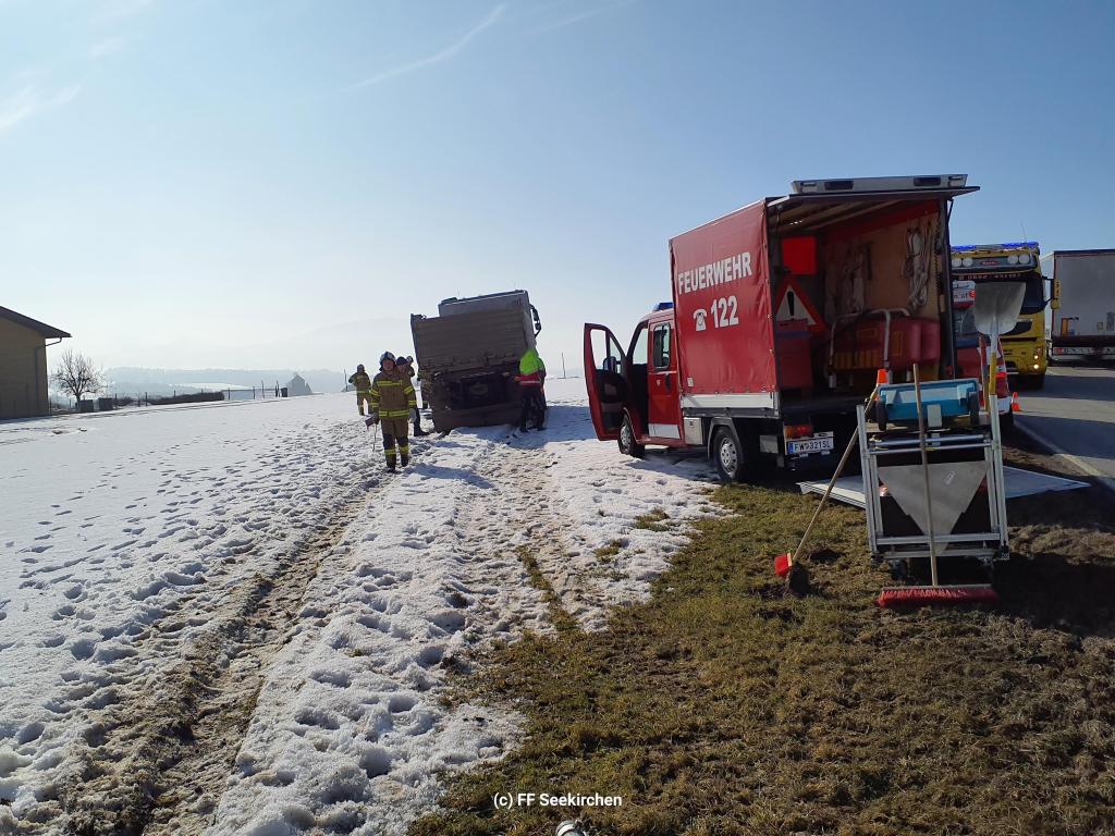 Heute Vormittag ereignete sich ein Verkehrsunfall auf der L238 Seekirchner Landesstraße. Ein PKW kollidierte dabei mit einem entgegenkommenden LKW. Ersthelfer versorgten den Lenker des PKW, welcher in weiterer Folge durch den Notarzthubschrauber abtransportiert wurde. Durch den seitlichen Aufprall wurde der Dieseltank des LKW beschädigt, wodurch eine größere Menge Diesel ausgetreten ist. Nach Absprache mit einem Sachkundigen Organ der BH Salzburg Umgebung, muss das verunreinigte Erdreich abgetragen werden. Im Einsatz standen die Feuerwehr Seekirchen mit dem Löschzug Wirthenstätten, das Rote Kreuz mit einem Fahrzeug und dem Notarzthubschrauber, mehrere Polizeistreifen sowie ein Bergeunternehmen.