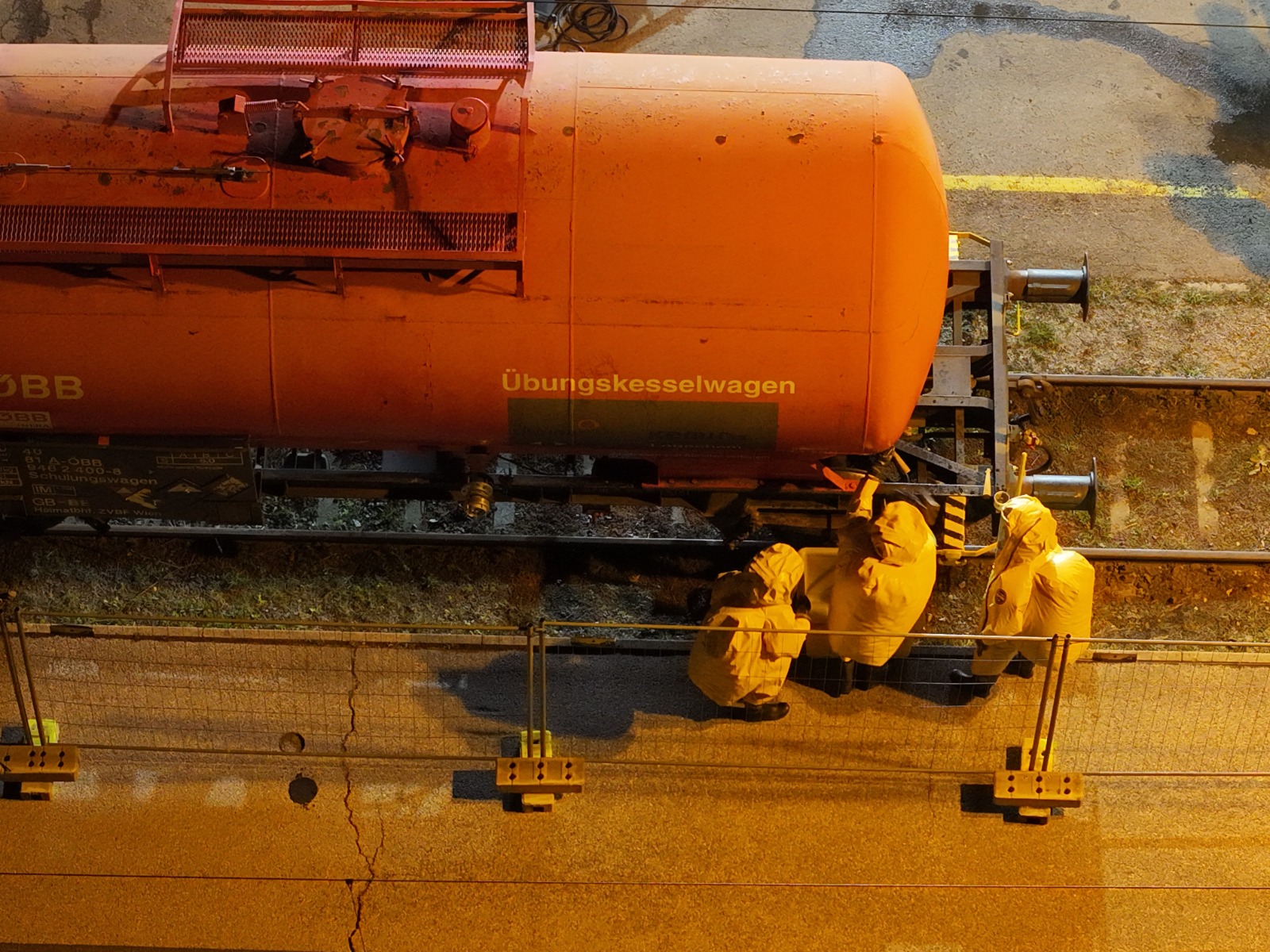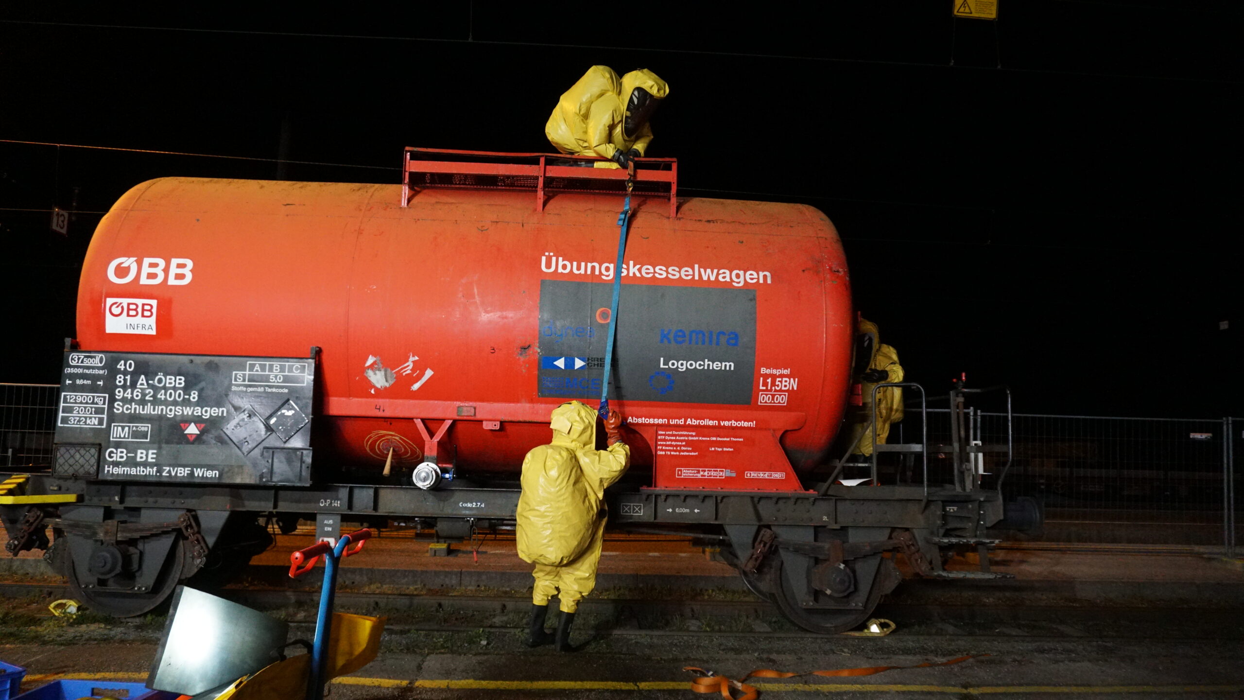Abdichten unter Schutzstufe 3 (Schutzanzug): Stoppen eines simulierten Flüssigkeitsaustritts am Kesselwagen unter schwerem Chemiekalienschutzanzug.