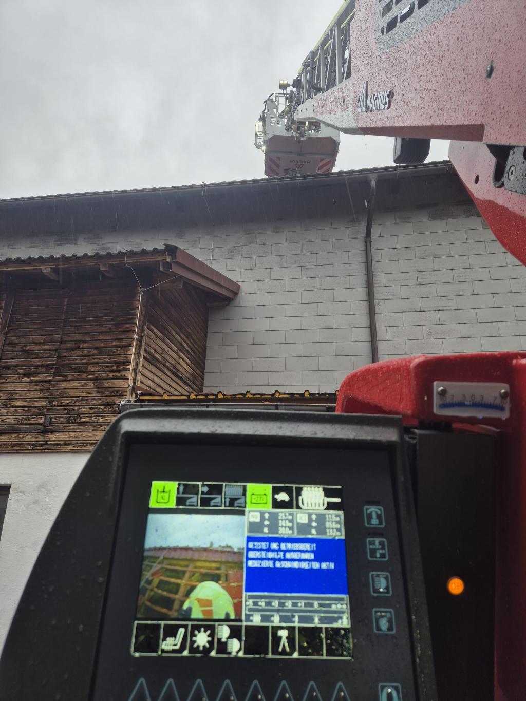Während der Einsatznachbesprechung wurde die Drehleiter zu einem abgedeckten Wirtschaftsgebäude in Henndorf angefordert. Die Mannschaft rückte umgehend aus. Nach der Lageerkundung positionierte sich die Drehleiter an der Einsatzstelle und unterstützte die Feuerwehr Henndorf beim Zudecken des Daches. Rund 100 Dachziegel wurden neu eingedeckt.