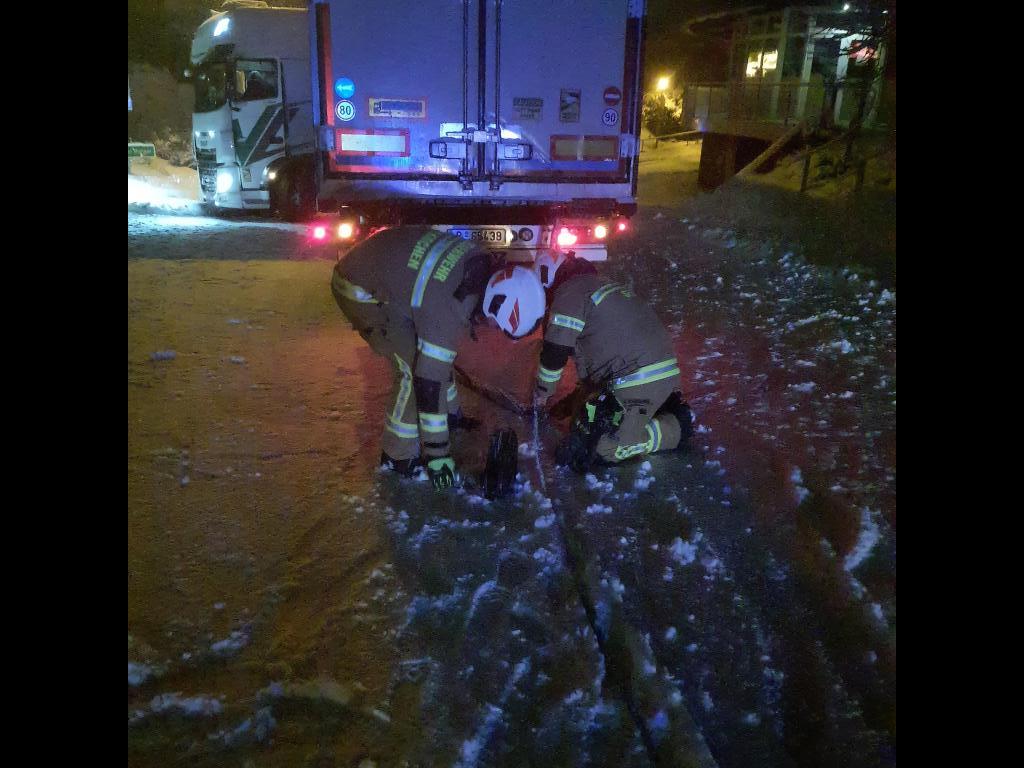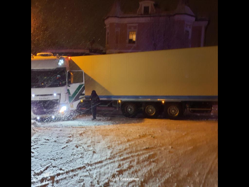 Die Feuerwehr Seekirchen wurde um 22:31 Uhr zur Bergung eines Sattelzugfahrzeugs gerufen. Das Fahrzeug war im Bereich der Kreuzung Hauptstraße / Wallerseestraße aufgrund der vorherrschenden Schneefahrbahn ins Rutschen geraten. Der LKW kollidierte dabei mit dem Bordstein und blieb manövrierunfähig auf der Fahrbahn stehen. Das Fahrzeug konnte sich aus eigener Kraft nicht mehr befreien, wodurch die Kreuzung teilweise blockiert war.